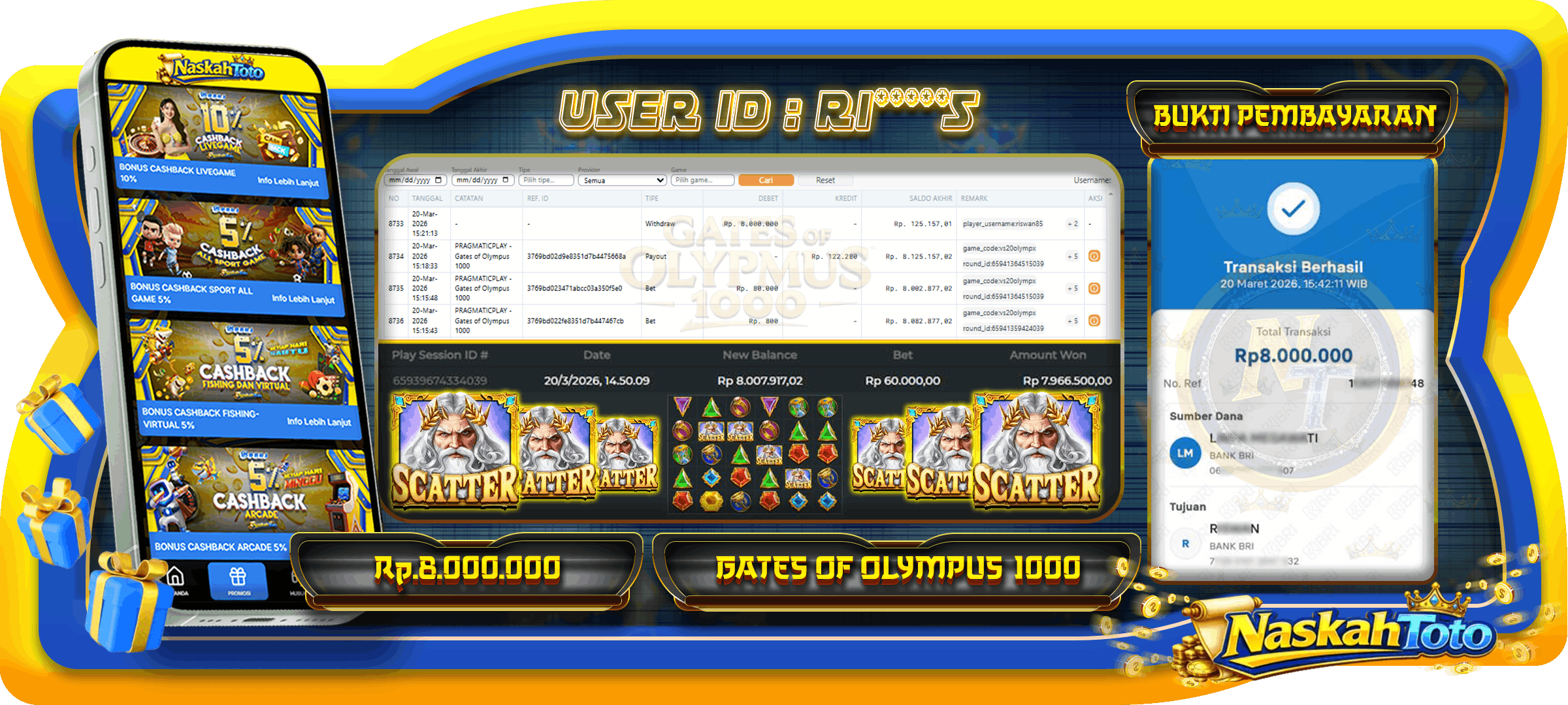 Selamat kepada ID: RI****** telah berhasil melakukan penarikan sebesar Rp.8.000.000 dengan kemenangan fantastis pada permainan GATES OF OLYMPYUS 1000 di situs Naskahtoto. Pelunasan dilakukan secara langsung setelah member mengisi formulir withdraw tanpa ada persyaratan tambahan. Bukti pembayaran yang tertera merupakan bukti pembayaran yang VALID dan langsung masuk ke rekening terdaftar member.